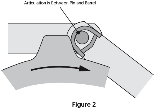 A simple solution was seen in the introduction of the RB series where the barrel is reversed to allow the chain to run open end forward. In this event instead of the articulation occurring between the barrel and tooth flank it occurs inside the internal area where the pin will rotate within the barrel (fig. 2). This is preferable since the components are specifically suited to contact between two hardened bearing surfaces along the entire width of the chain.